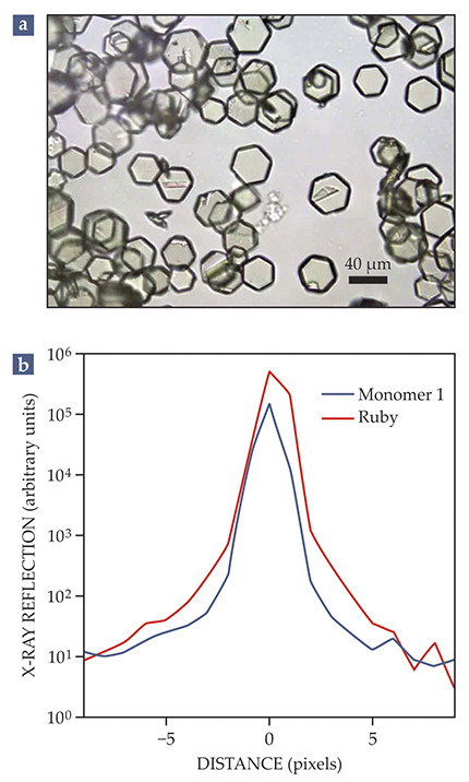 To push the limits of perfection, one will often recrystallize a sample several times, until the full width at half maximum of the Bragg reflections approaches the x-ray source’s resolution limit. Diffraction experiments at a brilliant light source have confirmed that the quality of the monomer crystals can rival that of a ruby reference crystal, as shown in figure