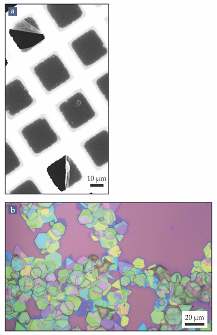 Polymer sheets under the microscope. (a) In this scanning electron microscope image, a single-monolayer polymer sheet spans a grid of micron-sized holes. The two ruptures, at the top left and bottom of the image, were likely induced either by drying effects or by the electron beam. The image contrast along those ruptures confirms the sheet’s presence. (b) An optical micrograph shows stacks of partially exfoliated polymer sheets on a silicon–silicon dioxide wafer. The colors of the stacks indicate their thicknesses, which range from approximately 70 sheets (green) to roughly 10 (dark blue). (Adapted from H. Beyer et al., Nanoscale 9, 9481, 2017, doi:10.1039/C7NR02210G