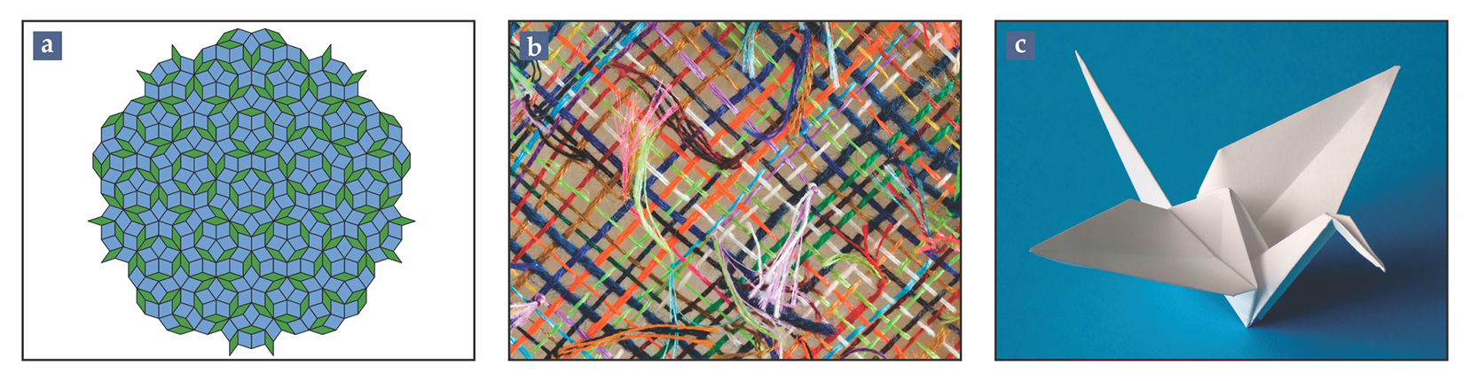 Inspiration for the future. Two-dimensional polymerization techniques could potentially be used to engineer materials with structures resembling (a) Penrose tilings, (b) woven fabrics, and (c) origami birds with moving wings.