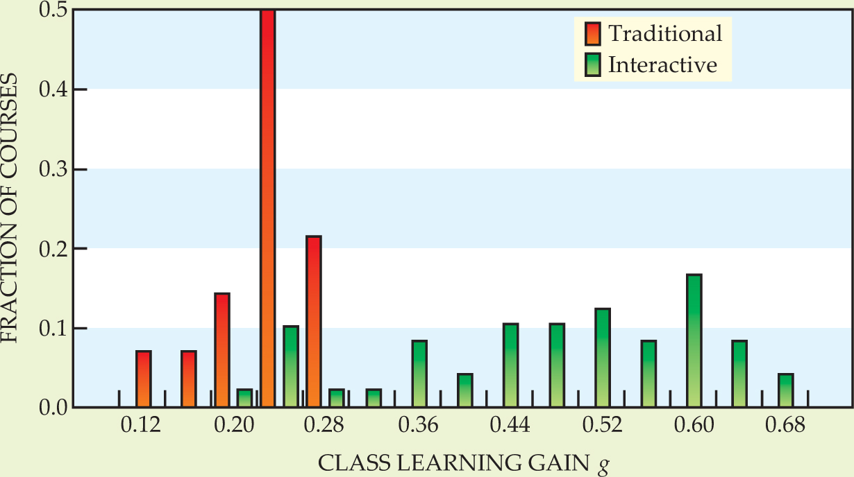 Figure 1. Distributions of learning gain in introductory college-level physics courses taught with different instructional strategies. The class learning-gain parameter g (defined below) was calculated by testing every student with the 30-question Force Concept Inventory at the start of the course and then again at its completion.7 The red histogram is for traditional lecture-based classes. The green histogram, for classes using interactive learning strategies, shows that students in those classes significantly outperformed students in more traditional classrooms.