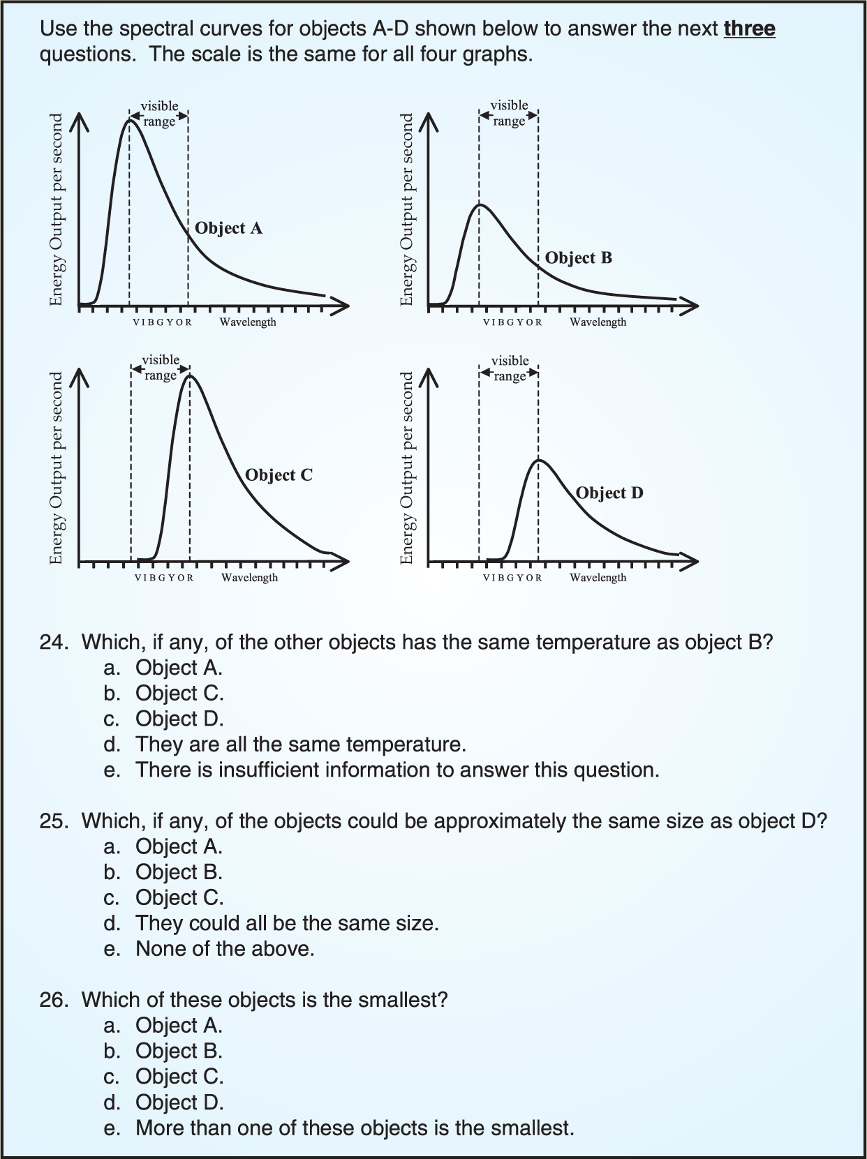 Figure 2. A sample of three questions from the Light and Spectroscopy Concept Inventory used to measure the learning gain of classes in Astronomy 101 courses.11 To answer these particular questions correctly, the student must understand both Wien’s law and the Stefan-Boltzmann law.