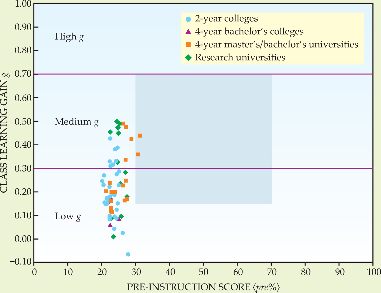 Figure 3 shows a plot of learning gain g, measured with the LSCI astronomy questions, versus class-averaged pre-instruction score for Astro 101 courses in our study, sorted by type of institution. For comparison, the shaded region indicates the range of results for Hake’s introductory-physics study. The boundaries at g = 0.3 and 0.7 separate the ranges of learning gain that Hake characterized as low, medium, and high.