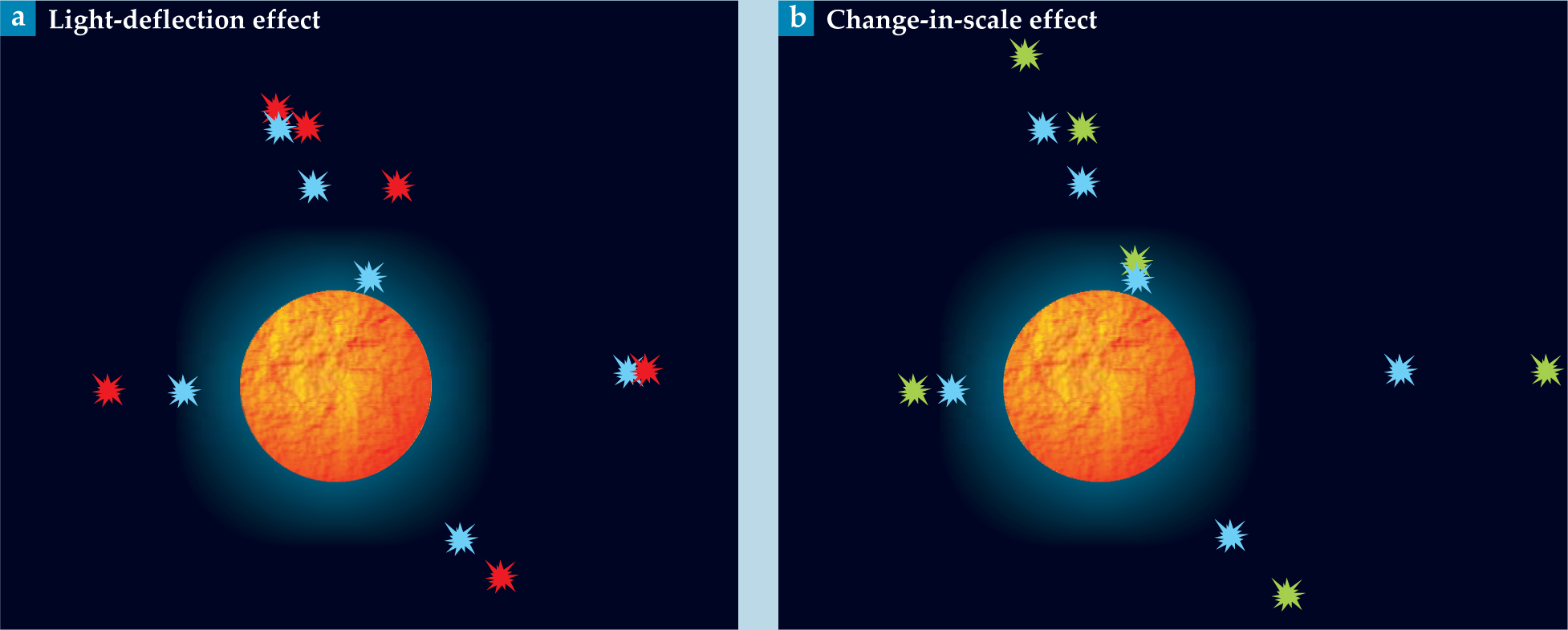 Fortunately, there is one characteristic difference between the two effects. Light deflection is greatest for those stars closest to the limb of the Sun and minimal for those stars far from it. The reverse is true under a change of scale: Stars far from the center of the plate suffer the greatest change in position, while stars near the plate’s center are affected least. Thus straightforward comparison of the positions of a number of stars on the two plates can, in principle, disentangle the effects.