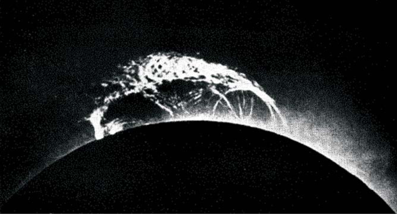 A remarkable solar prominence that occurred during the 1919 eclipse, photographed from Principe, an island off the coast of western Africa.