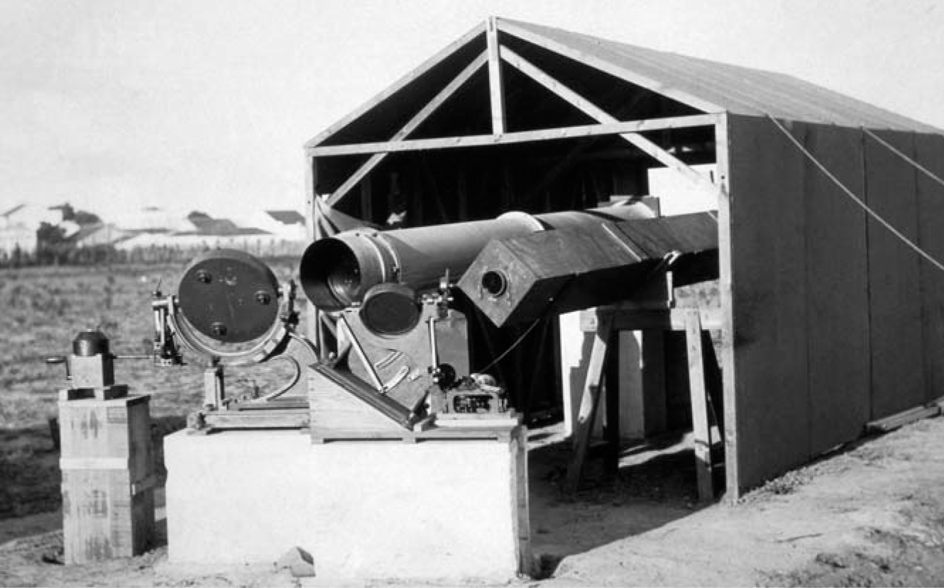 Instruments at Sobral, Brazil. The 4-inch lens is in the square tube on the right, and the astrographic lens, chosen for its wide field of view, is in the circular tube on the left. In front of the tubes are mirrors that are driven by a mechanism that keeps the stellar images at the same position on the plates during an exposure. The mirror on the left was the chief suspect in the poor-quality astrographic-lens images produced during the 1919 eclipse.