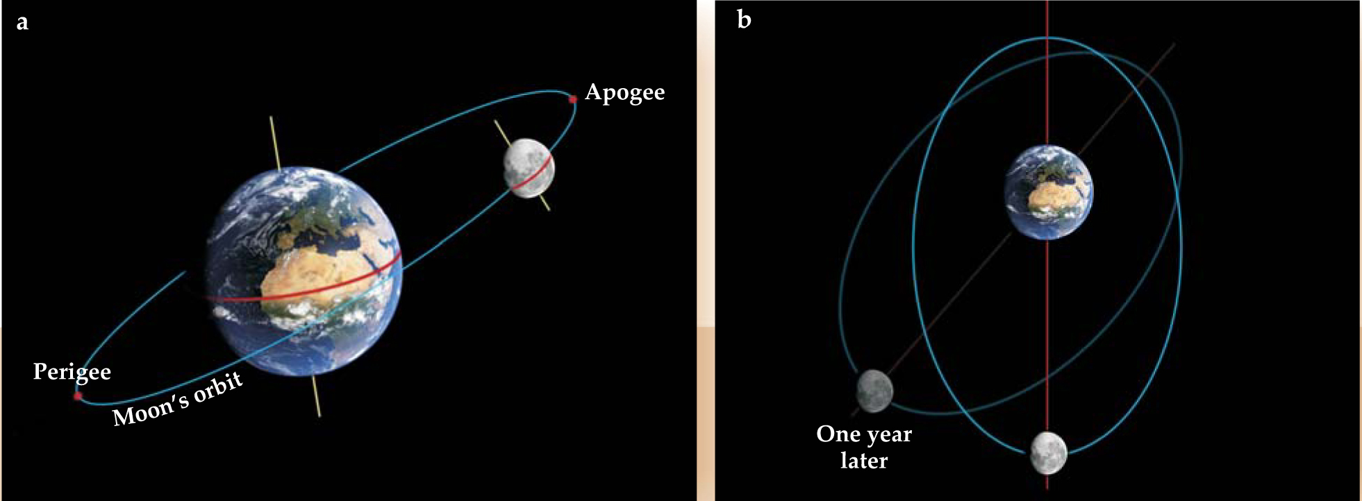 Figure 2. The Moon’s orbital motion. (a) The apogee and perigee are key markers of the lunar orbit. Collectively, the two points are called apsides. (b) The orbit and apsides rotate at a rate of about 40° per year. The eccentricity of the orbit is exaggerated in the illustrations.