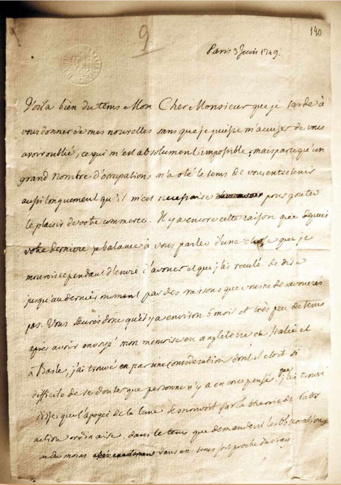 Figure 5. In a June 1749 letter written to his friend, mathematician Gabriel Cramer, Alexis Clairaut describes how he has reconciled the motion of the Moon’s apsides with Newton’s law of gravitational attraction.