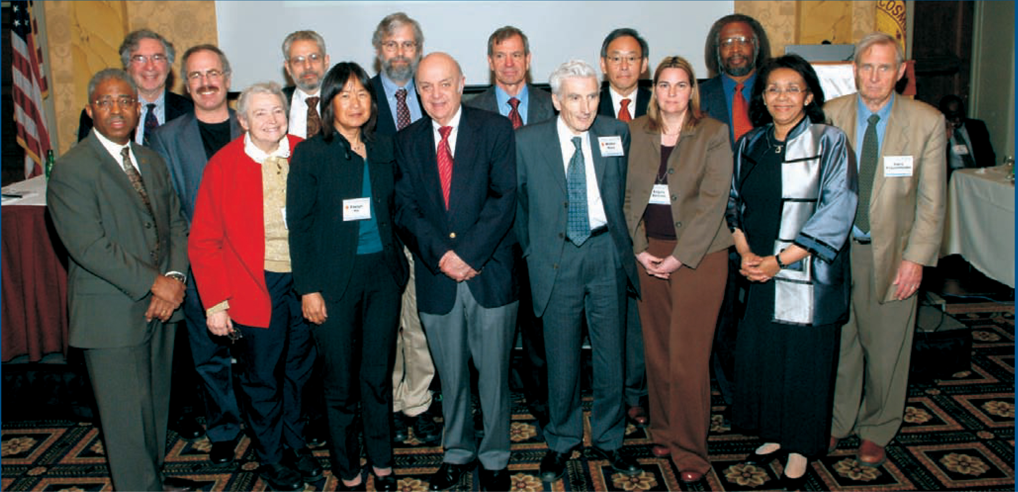 Symposium speakers. (L–R) James Stith (AIP), Marc Brodsky (AIP), Raymond Jeanloz (UC Berkeley), Mildred Dresselhaus (MIT), Spencer Weart (AIP), Evelyn Hu (UCSB), Philip Bucksbaum (Stanford U), Marvin Cohen (UC Berkeley), Lawrence Crum (U Washington), Martin Rees (Cambridge U), Steven Chu (Lawrence Berkeley), Angela Belcher (MIT), S. James Gates (U Maryland), Shirley Malcom (AAAS), Hans Frauenfelder (Los Alamos).