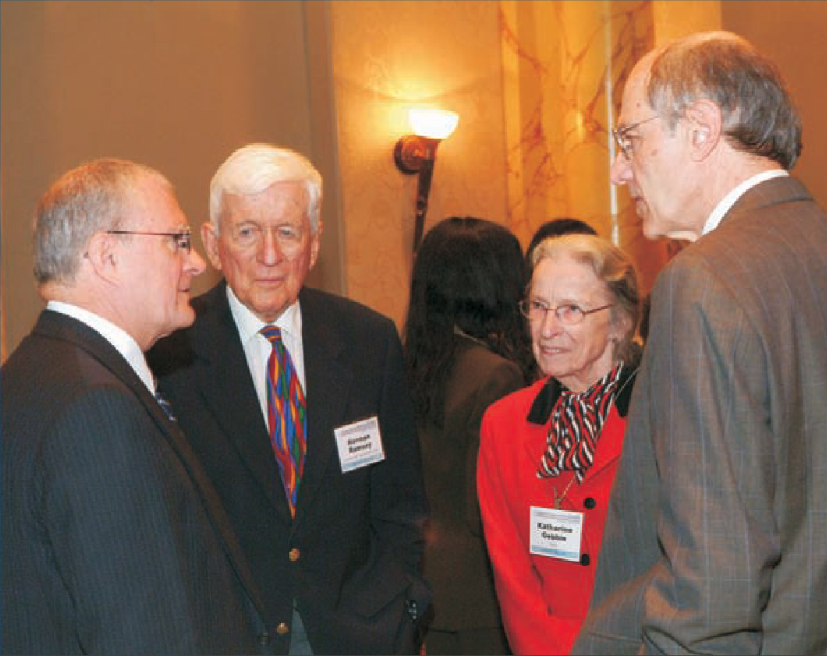 Presidential science adviser John Marburger (left) talking with Norman Ramsey (Harvard U), Katharine Gebbie (NIST), and Joe Eberly (U Rochester).