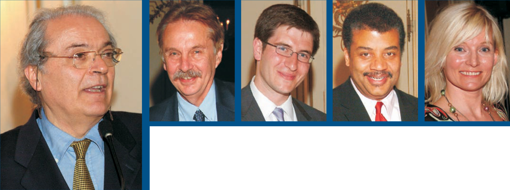 Award winners. During the celebrations on 3 May, the Tate Medal for International Leadership in Physics, awarded by AIP every two years, was presented to Erio Tosatti (far left) for his “tireless effort in helping scientists from developing countries.” The AIP Science Writing Awards in four categories went to (from left) Jon Palfreman (broadcast media; WNET New York, “Innovation: Light Speed”), Michael Moyer (journalist; Popular Science, “Journey to the 10th Dimension”), Neil deGrasse Tyson (scientist; Natural History Magazine, “In the Beginning”), and Bea Uusma Schyffert (children’s books; Chronicle Books, The Man Who Went to the Far Side of the Moon).