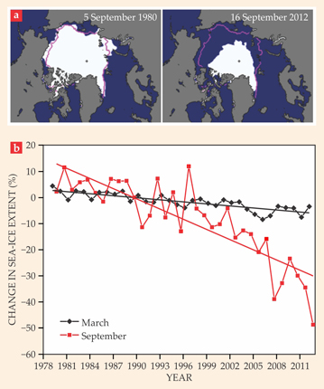 Figure 2. The decline in areal extent of Arctic sea ice has been mapped daily since 1979 by satellites using passive microwave sensors. (a) Between September 1980, when the summer minimum was 7.5 million square kilometers, and September 2012, when there were 3.4 million square kilometers of ice, the end of summer ice extent has shrunk by 55%. (b) Minimum (September) and maximum (March) ice-extent anomalies for each year are plotted beginning in 1979, when satellite observations began. Each data point represents the departure of the measured ice extent in March and September each year from the average of those months over the reference period 1979–2012. (Data are from the Sea Ice Index, National Snow and Ice Data Center; see http://nsidc.org/data/seaice_index. Walt Meier provided the plot.)