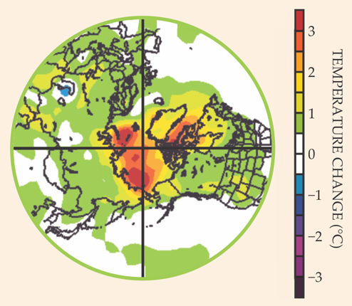 Figure 3. Annual near-surface air temperature changes in the Northern Hemisphere are mapped as the average temperature measured between 2001 and 2012 relative to the average temperature for the 30-year baseline period 1971–2000. Arctic temperature changes of +2–3 °C, compared with the more modest rise of +0.5–1 °C in midlatitude regions, exemplify Arctic amplification of global climate change. Higher temperatures in all parts of the Arctic indicate a response to global change rather than to natural regional variability. (Data are from NOAA’s Earth System Research Laboratory, Boulder, Colorado: http://www.esrl.noaa.gov/psd.)