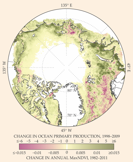 Figure 4. The maximum Normalized Difference Vegetation Index (MaxNDVI) is a measure of vegetation greenness observed from space. It is also a proxy for aboveground biomass at the peak of the growing season. Shown here is the change it underwent from 1982 to 2011 and, with the same color bar, the change in total annual primary production—a measure of photosynthesis by algae and phytoplankton in units of grams of carbon per square meter per year—over the period 1998–2009 in the Arctic Ocean and adjacent waters. (Adapted from ref. 3, prepared by Karen Frey and Uma Bhatt.)