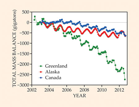Figure 5. The Greenland ice sheet and glaciers and ice caps in the Gulf of Alaska region and the high Canadian Arctic have been losing mass, by melting and iceberg calving, since GRACE satellite observations began more than 10 years ago. Mass loss, in gigatons, from the Greenland ice sheet is accelerating and is currently almost three times the combined total loss from the Alaskan and Canadian sources. The seasonal cycle of winter snow accumulation and summer melting is evident in the oscillations recorded from each region. (Adapted from ref. 7, prepared by Marco Tedesco and Gabe Wolken.)