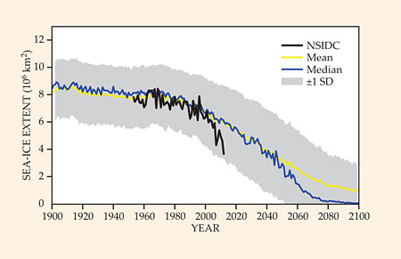 Figure 6. Sea-ice extent is declining faster than models predict. The large spread of ±1 standard deviation (SD; gray) in 84 predictions of ice extent from 36 different current models underscores the uncertainty about the future state of the ice cover and the need to improve our understanding of air-ice-ocean processes and their representation in the models. These and similar results form the basis for the fifth assessment report of the Intergovernmental Panel on Climate Change. The black curve plots observational data dating back to 1953 from the National Snow and Ice Data Center (NSIDC). The yellow and blue curves are the mean and median of the model results, respectively. (Adapted from ref. 13.)