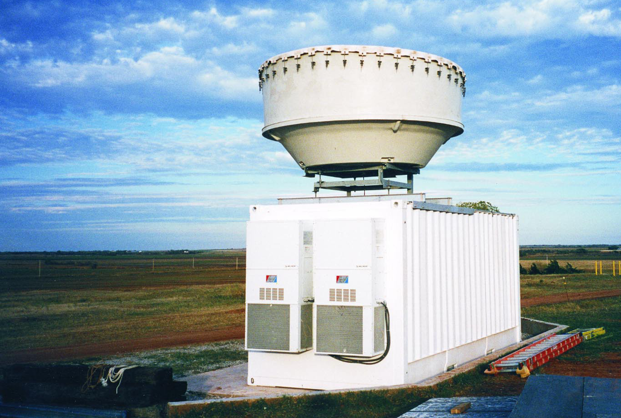 Figure 1. Cloud radar system at the central facility of the Atmospheric Radiation Measurement (ARM) program, near Lamont, Oklahoma, probes the extent and composition of clouds over the site at millimeter wavelengths. ARM was created to elucidate the interaction between clouds and radiative fluxes in the atmosphere for the purpose of creating better climate and weather models.