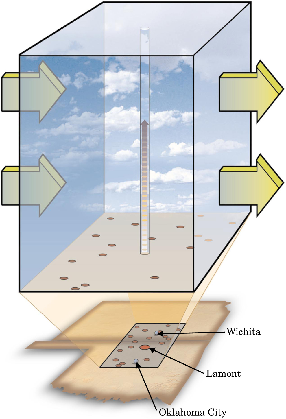 Figure 2. The ARM Southern Great Plains site surrounds the Lamont, Oklahoma, facility with 17 satellite stations deployed throughout the 140 000-km2 site in Oklahoma and Kansas. The atmospheric cube covering the site represents a single-column climate model; the arrows indicate the energy and water transport that determine the column’s lateral boundary conditions. The much narrower column at the center represents radar, lidar, and other instruments probing the clouds in a conceptual “soda straw” over the Lamont facility.