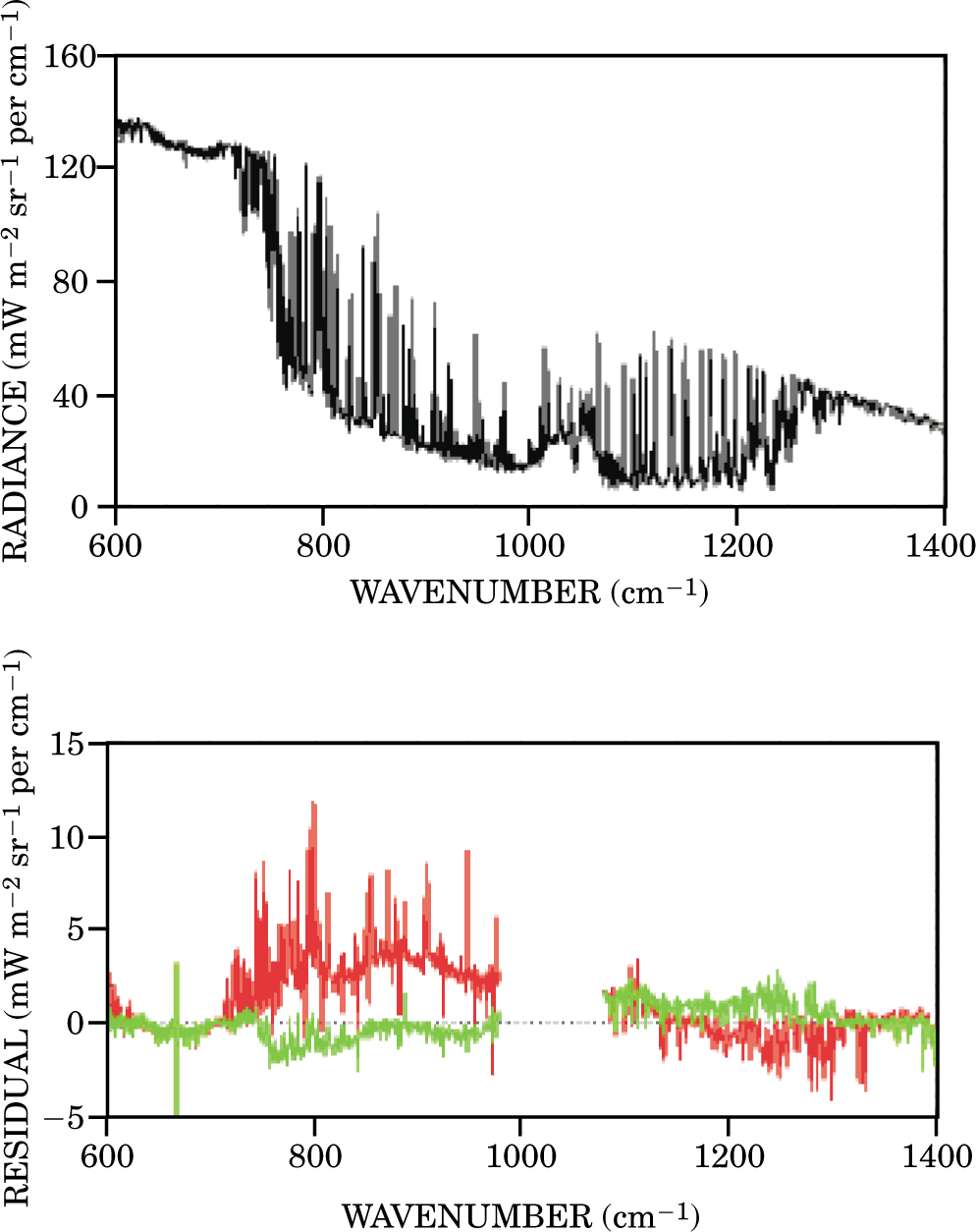 Figure 3. Thermal radiation by the atmosphere, plotted (top panel) against reciprocal wavelength, shows the atmospheric window between 8 and 12 µm that lets thermal radiation from Earth’s surface escape into space. The atmospheric absorption is measured by an infrared interferometer on the ground that looks up at the zenith on a cloudless Oklahoma day. The trough, showing weak continuum water-vapor emission, is filled with discrete H2O lines and hemmed in at its long-wavelength end by strong CO2 absorption. The bottom panel shows the observed minus the calculated radiance both for a new model2 of water-vapor absorption (green curve) based on ARM observations, and for an older, pre-ARM model (red curve). The gap near 1000 cm−1 indicates a band of significant ozone absorption. The new model reproduces the water absorption and re-emission quite well.