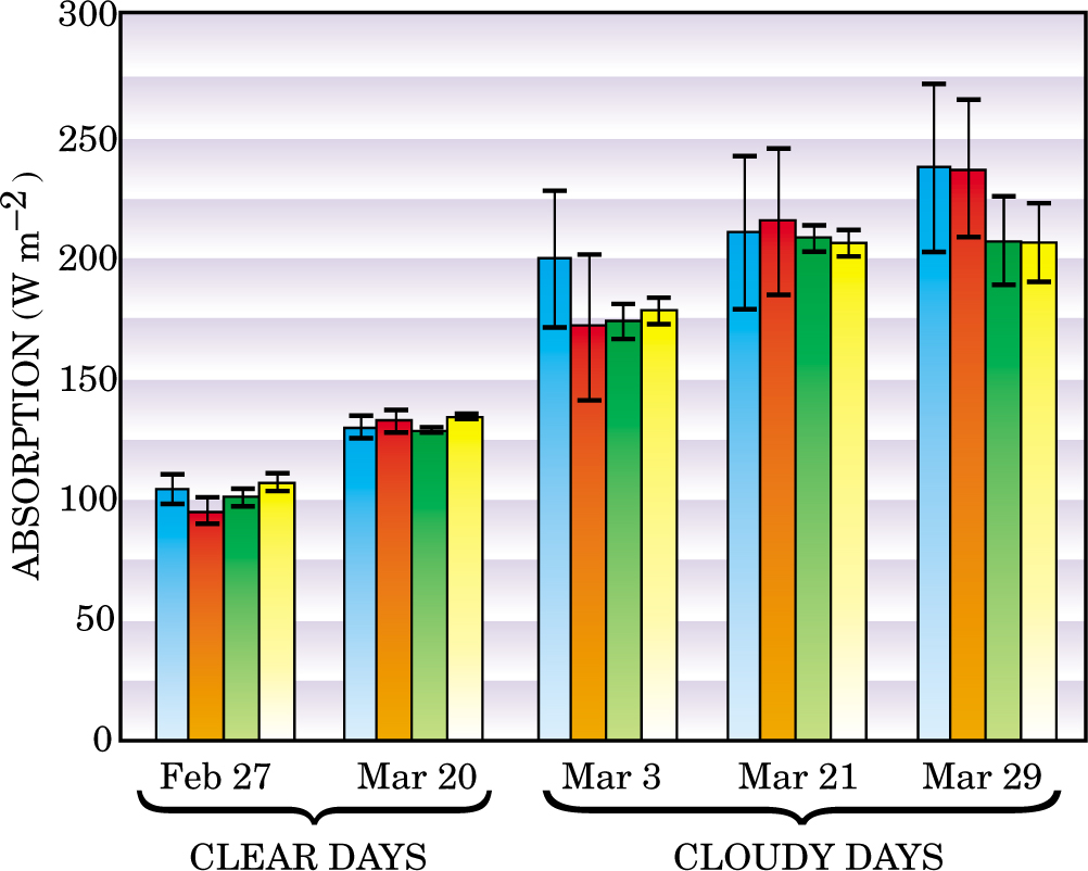 Figure 4. Solar absorption by a column of air extending from the ground up to 7 km was measured by comparing ground and aircraft measurements at the Southern Great Plains site on two clear days and three cloudy days in 2002. The blue and red columns show measurements with two different radiometer sets, and the green and yellow columns show the predictions of two different models. The differences between these recent measurements and the predictions are reassuringly small.