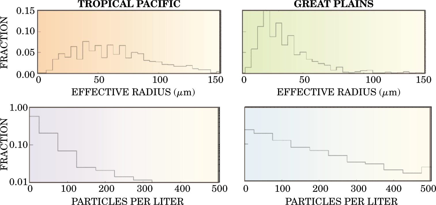 Figure 5. Ice crystal distributions in cirrus clouds measured by ARM in the tropical Pacific and at the Southern Great Plains site. A combination of millimeter-wave radar, ground-based infrared interferometry, and balloon measurements yields effective particle radii (top panels) and number density (bottom). The ice particles in the higher-lying tropical clouds are typically larger, but there are fewer of them per unit cloud volume.
