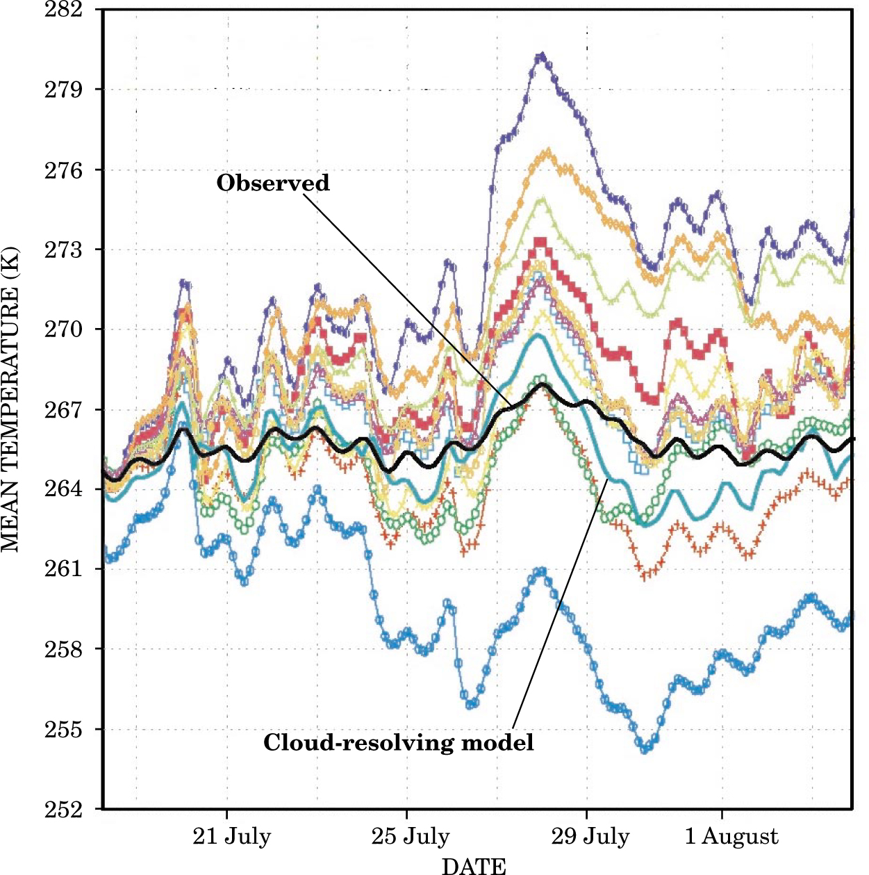 Figure 6. Comparing various climate model calculations (colored curves) with the measured mean atmospheric temperature (black curve) over the ARM Southern Great Plains site for two weeks in the summer of 1995. Except for one cloud-resolving-model curve (labeled), all the other colored curves are calculated from single-column models. All the models were fed every three hours with the same updated boundary conditions measured at the sides, top, and bottom of the column. Still, with increasing time, the model curves drift farther and farther from the measured initial temperature and from each other.