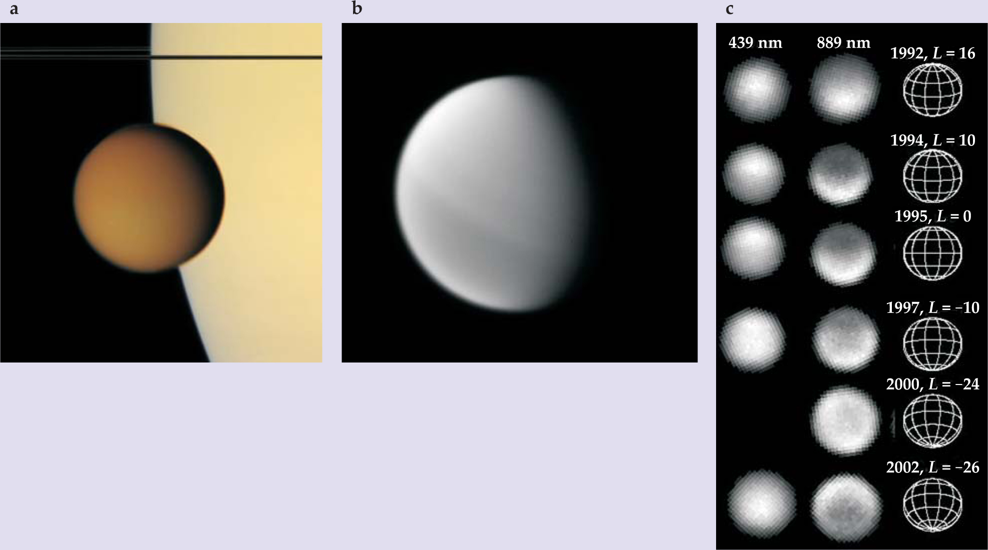 Referring to the Sun, Shakespeare wrote this line sometime around 1590, about two Titan years before the discovery of that moon by Christiaan Huygens in 1655. Titan was given its name by John Herschel two centuries later, but little was learned about it until 1907, when the sharp-eyed Catalan astronomer Josep Comas Sola noticed that Titan’s tiny disk, barely perceptible even on a good night through a large telescope, is dark at the edges. Comas Sola correctly noted that this “limb-darkening” effect is also seen on Neptune and thus inferred that Titan has an atmosphere. That was confirmed in 1944 by Gerard Kuiper, who demonstrated that Titan’s ruddy reflectance spectrum shows absorption bands due to methane. It turns out that methane plays similar roles on Titan to those water plays on Earth, and the recent deluge of data from large telescopes and the NASA–European Space Agency Cassini–Huygens mission shows that Saturn’s giant moon has a remarkably Earth-like meteorology. 1