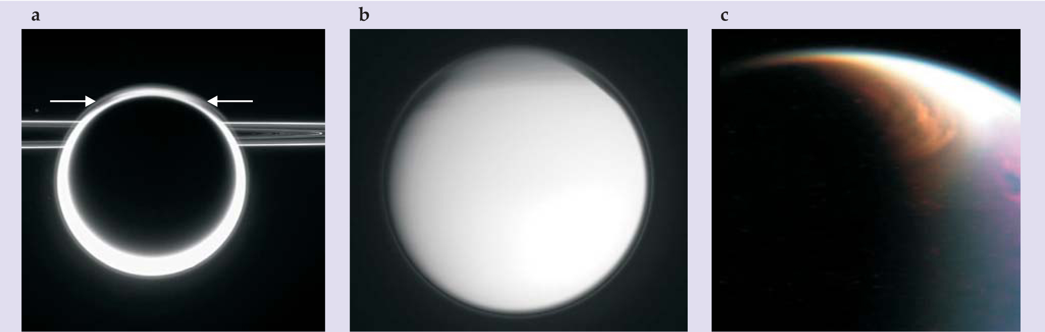 Figure 6. Haze layers, the polar hood, and a winter polar ethane cloud system. (a) A backlit Cassini Imaging Science Subsystem (ISS) image from June 2006 shows Titan in UV light, with Saturn’s rings in the background. Light scattered from the haze makes Titan appear as a ring, rather than the simple crecent that an airless world would show. The separation between the main and detached haze layers is subtly evident at northern midlatitudes where the arrows point. (b) In this full-disk ISS UV image from September 2007, the dark north polar hood is striking and connects to the thin detached haze layer. (c) A near-IR image taken by Cassini‘s Visual and Infrared Mapping Spectrometer in December 2006 (with blue, green, and red representing 2-, 2.7-, and 5-μm wavelengths, respectively) shows a banded cloud system, probably of ethane ice crystals deep in the atmosphere, around the north pole.