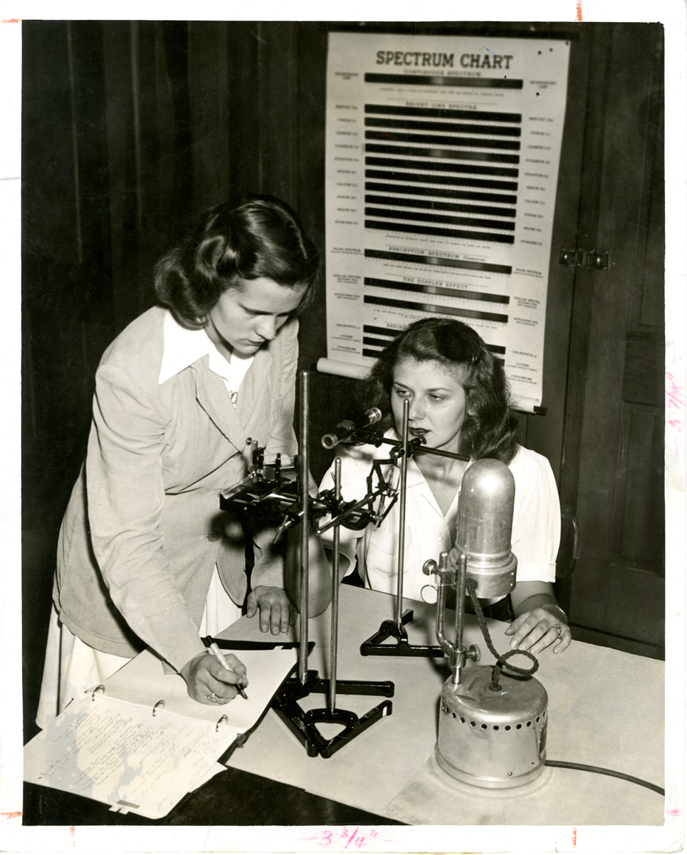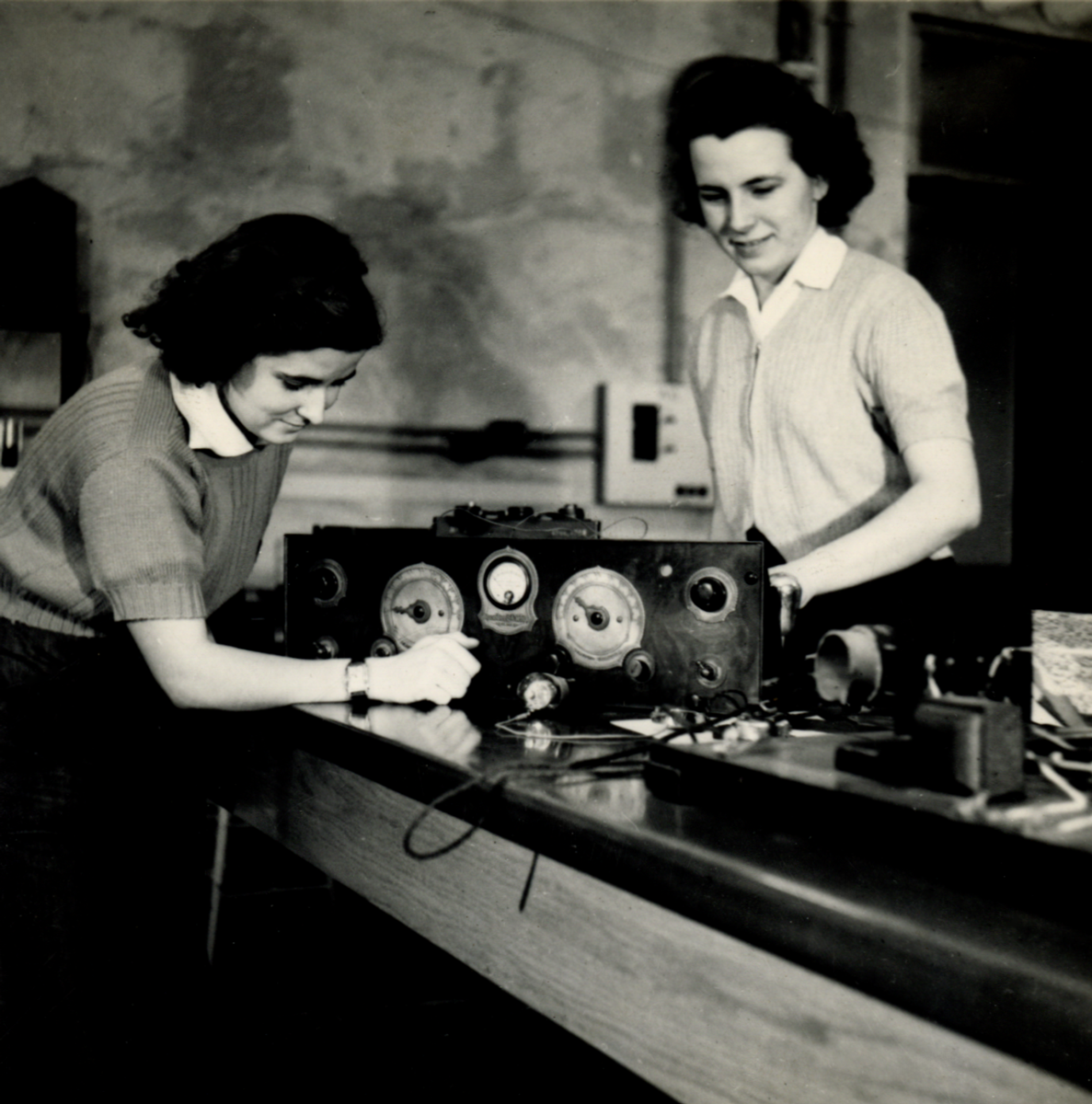Reina Sabel (left) and Barbara Wright (right) during a radiophysics class at Mount Holyoke College. Sabel and Wright attended the Charm School in the summer of 1940. (Photo courtesy of the Mount Holyoke College Archives and Special Collections.)