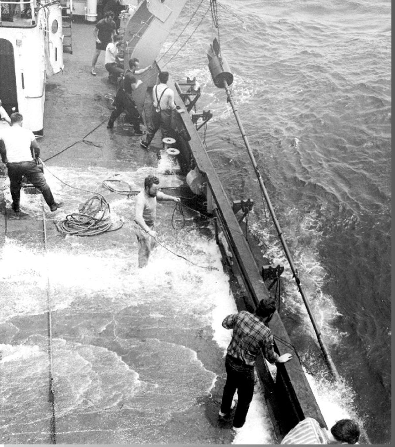 Figure 1. Crew aboard the Vema, a pioneering research vessel, extracted cores of deep seabed mud and clay in the 1960s to uncover changes in ocean conditions over time. Studies of tiny fossil shells in the cores showed that the oceans, for all their huge mass, were not as stable as most scientists had assumed. In various parts of the world, surface temperatures had changed several degrees in a few thousand years. If there had been any changes faster than that, the evidence was blurred by perturbations of the mud.