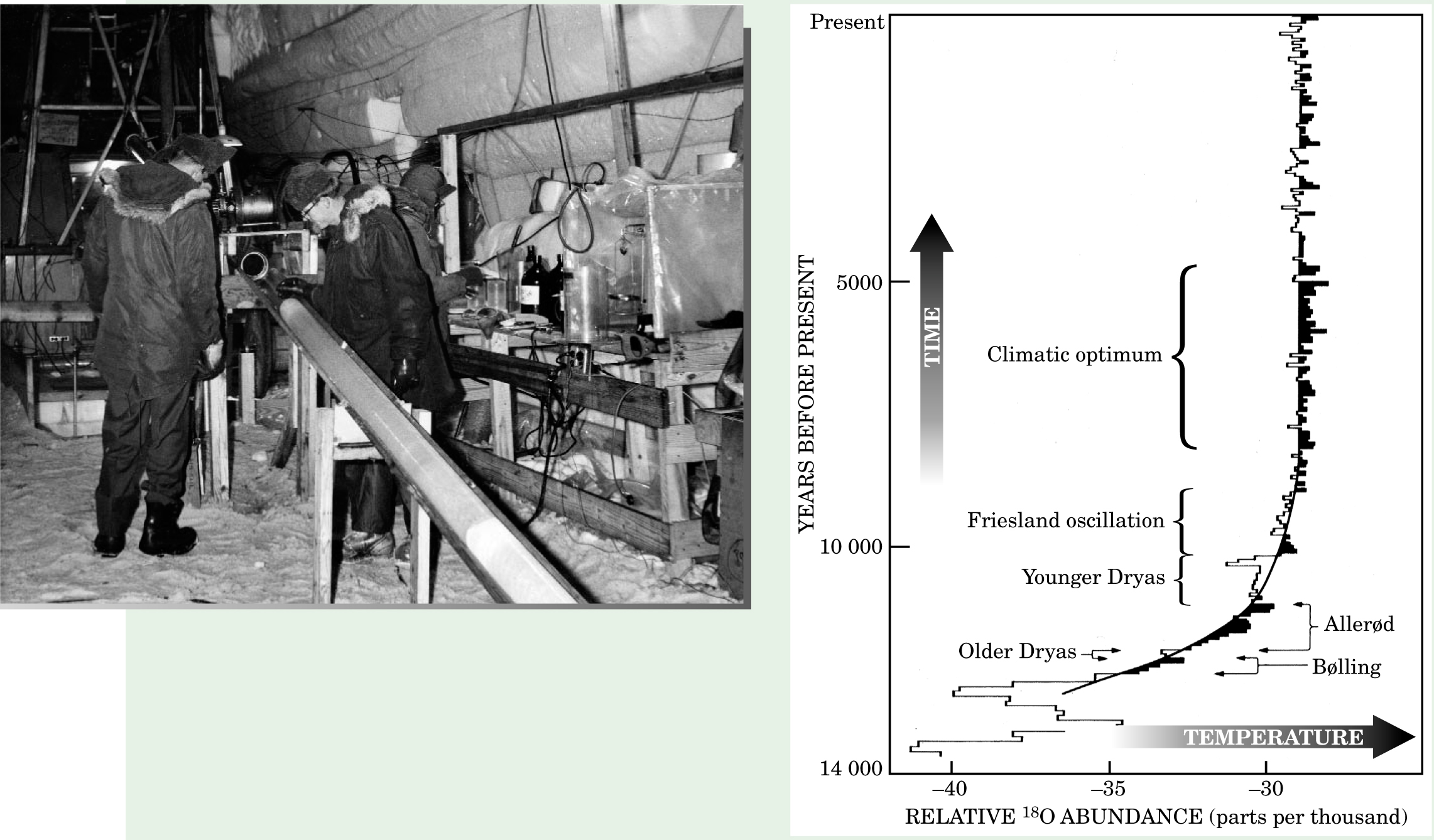 To get more reliable data, the ice drillers went to a second location, some 1400 kilometers distant from Camp Century. By 1981, after a decade of tenacious labor, they hit bedrock and extracted gleaming cylinders of ice 10 cm in diameter and more than two km deep; the deepest ice came from the last ice age, 14 000 years ago. The ratios of oxygen isotopes within the ice layers gave a temperature record showing what the researchers called “violent” changes. The most prominent of those, corresponding to the Younger Dryas oscillation, showed “a dramatic cooling of rather short duration, perhaps only a few hundred years.”