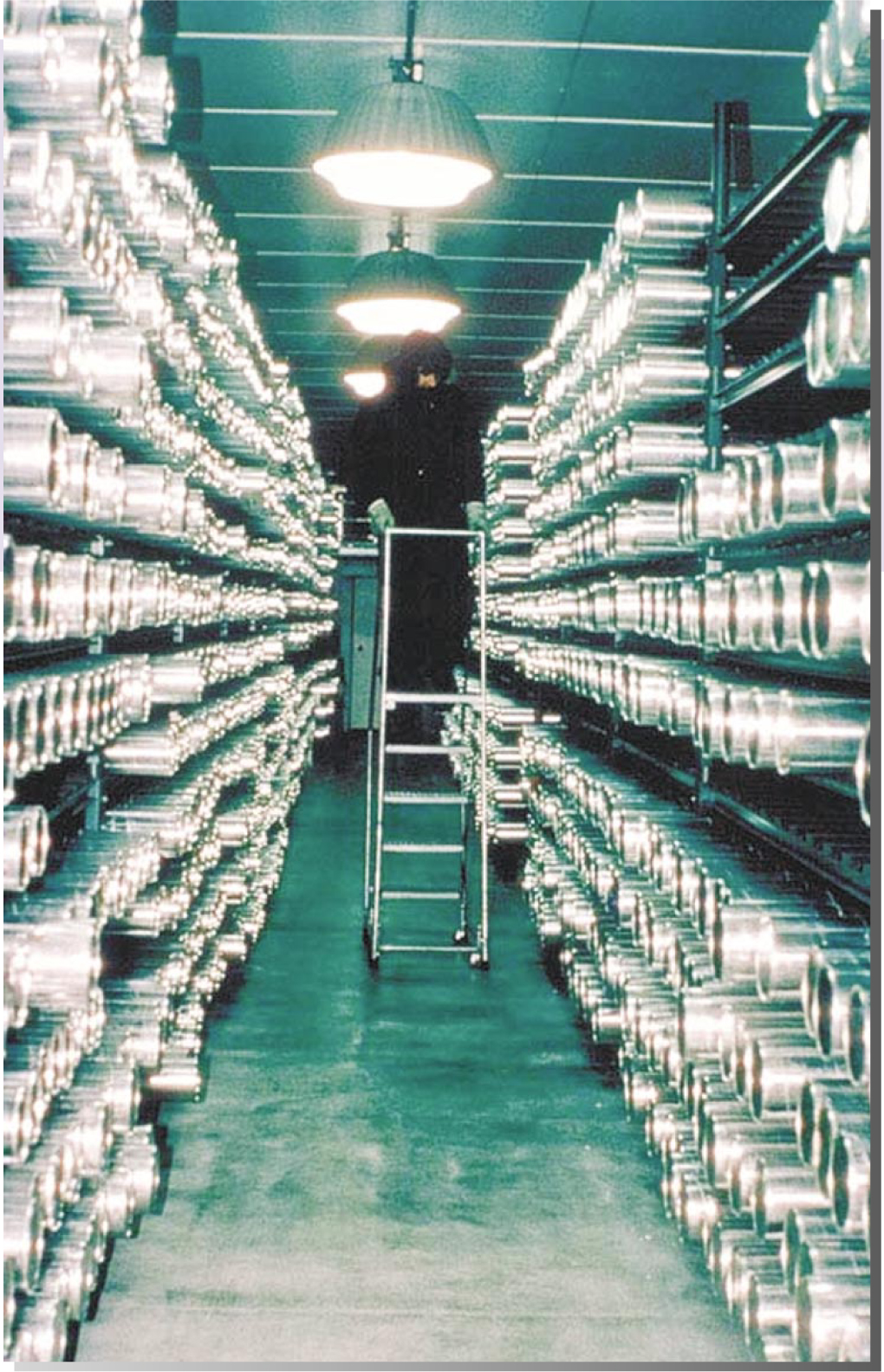Figure 5. Three kilometers of ice stored as a gleaming library of cylinders in the US National Ice Core Laboratory in Denver, Colorado. Analysis of the ice, drilled from the Greenland icecap during the 1990s, provided a compelling record of precipitous climate changes around the end of the last glacial epoch. The findings stimulated computer simulations of the atmosphere-ocean-ice system; those simulations suggested that such changes could befall us within the next few hundred years.