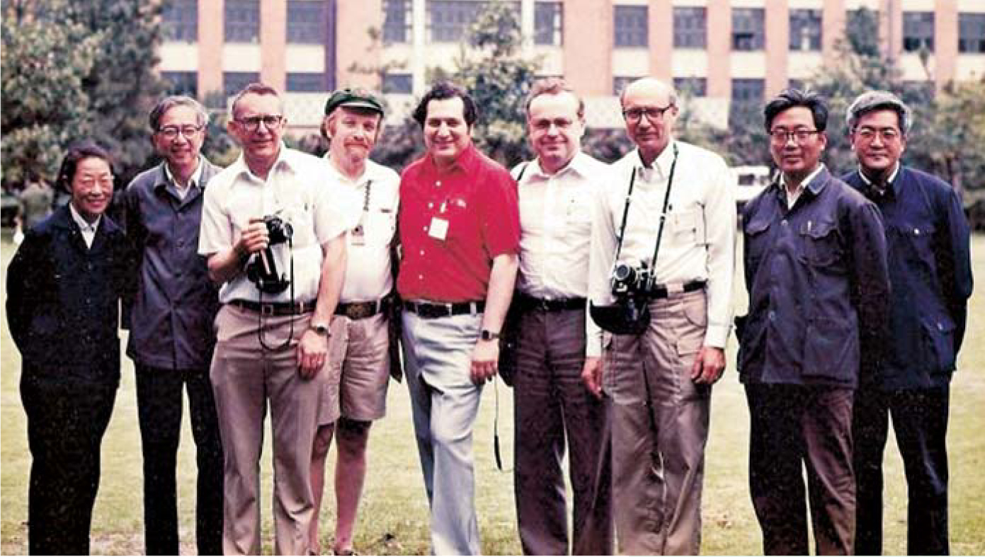 Figure 1. Laser spectroscopists, photographed in front of Fudan University’s physics building in Shanghai, China, to mark the International Conference on Lasers held there and in Beijing in 1980. Participants included, from left to right, Yu-Fen Li, Zhi-Ming Zhang, John Hall, George Temmer, Aram Mooradian, Herbert Walther, Richard Brewer, an unidentified scientist, and Fu-Ming Li.