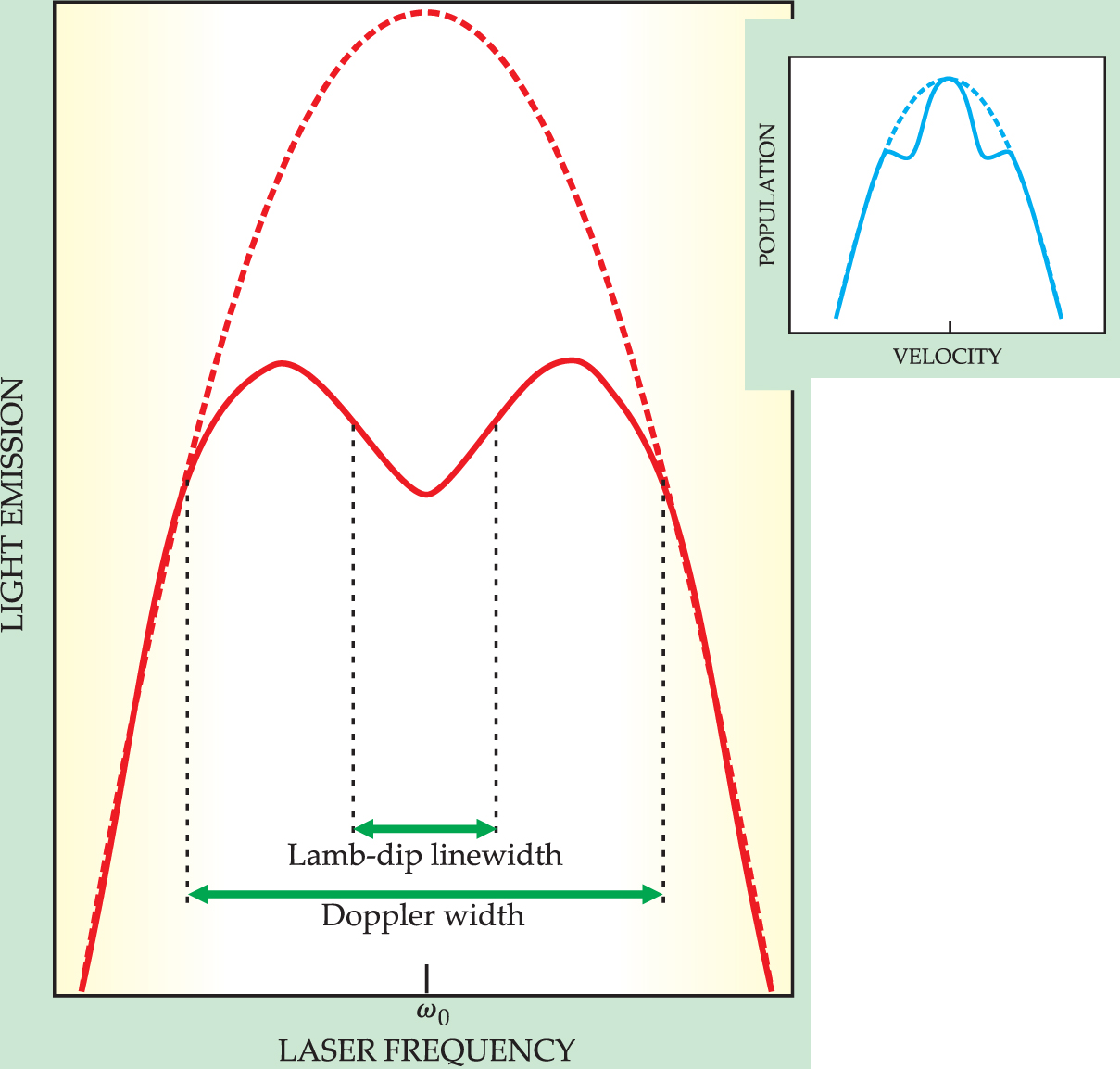 Figure 2. The Lamb dip illustrates the effect of a standing wave on the distribution of excited atoms in a laser cavity. Holes are “burned” in the Doppler-broadened output of a laser from the interaction of the beam—which can be thought of as two counterpropagating traveling waves—with a group of atoms whose Doppler-shifted resonant frequency matches the laser frequency (see inset). The intensity emitted by the laser depends on the population inversion, so the laser emission goes through a minimum—that is, the two holes merge into one—when the laser frequency is tuned to the atoms’ unshifted frequency ω 0. Due to various line-broadening mechanisms, the linewidth of the dip may be orders of magnitude wider than the natural linewidth of the laser emission (a few hertz), but still smaller than the width of the Doppler profile.