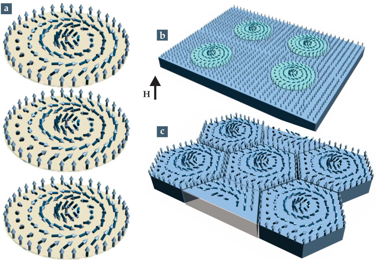 Magnetic skyrmions are nanoscale cylinders of spinning magnetization (a) embedded in a ferromagnet (b) under an applied magnetic field . The skyrmions’ magnetization is antiparallel to at their centers, is parallel to at distances far from the centers, and rotates radially with a fixed chirality for distances between. They’re known as Bloch-type skyrmions, one of the five possible configurations in uniaxial ferromagnets. For small values of , isolated skyrmions condense into a hexagonal lattice (c). (Courtesy of A. N. Bogdanov and C. Panagopoulos.)