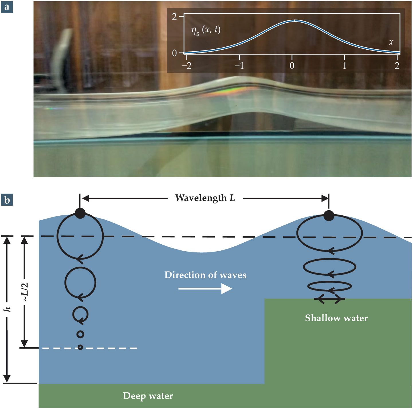 John Scott Russell’s solitary-wave solitons occur in shallow water channels, as shown in a laboratory reconstruction (a) of his original observation. (Adapted from ref. 6.) The inset is a typical localized solution of the Korteweg–de Vries equation for extremely shallow water. (Adapted from ref. 5.) (b) In deep water, waves propagate from left to right, whereas water particles orbit in circles around their average position. The diameters of the circular orbits shrink gradually with increasing distance from the surface down to half the wavelength . In shallow waters with depth less than , the orbits become elliptical and essentially flat at the bottom of the tank or seabed. (Image by A. N. Bogdanov and C. Panagopoulos, adapted by Donna Padian.)