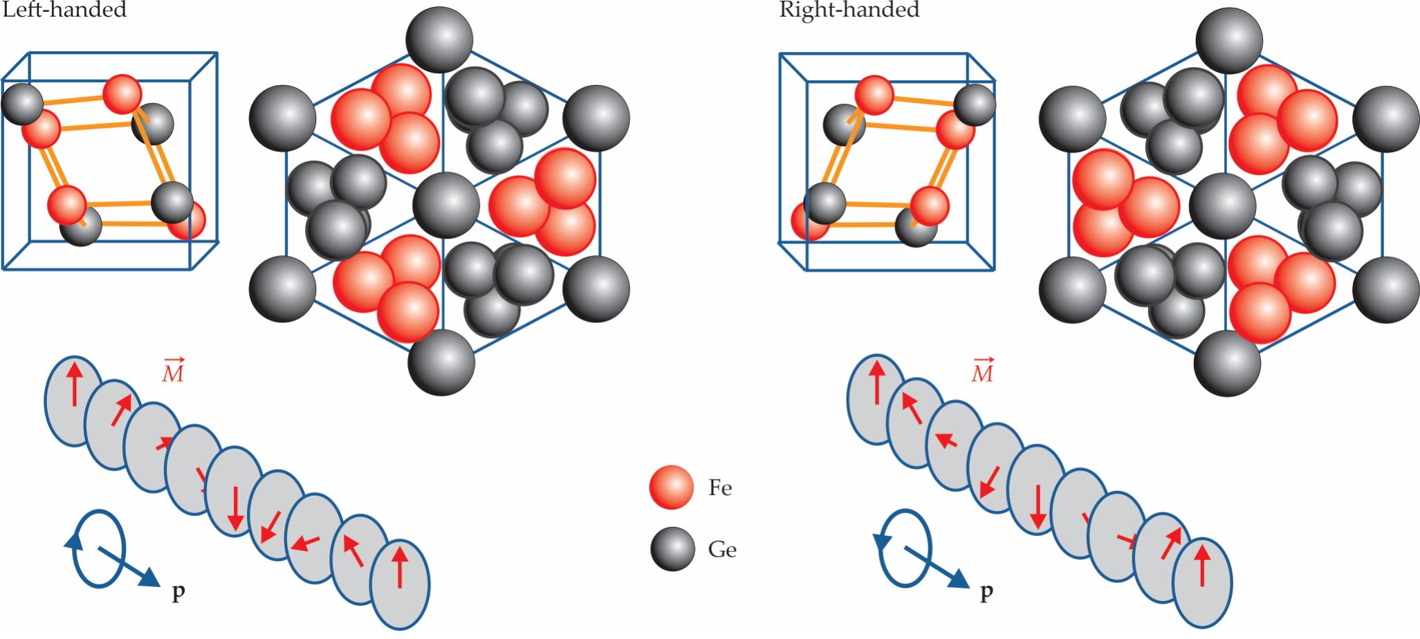 Chiral magnetic materials, or those with broken mirror symmetry, are a common and well-investigated group of noncentrosymmetric ferromagnets that host magnetic skyrmions. A chiral object and its mirror image have two distinguishable forms of the crystal: left- and right-handed enantiomers. The enantiomeric pair of cubic iron monogermanide, FeGe, is shown in figure 3.