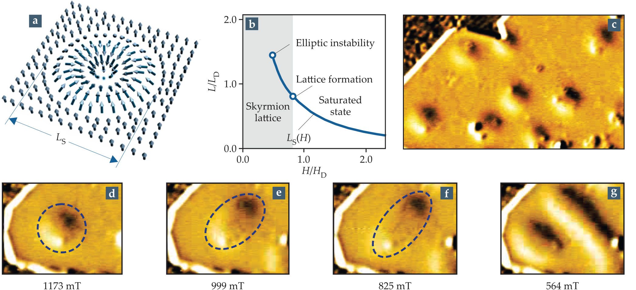 Isolated Neel-type skyrmions (a) have magnetization rotating along the direction of propagation. (b) The calculated skyrmion diameter shrinks as the applied magnetic field increases. The characteristic parameters and are the helix period and saturation field, respectively. (c) Skyrmions in an iron-palladium-iridium nanolayer are isolated at an applied magnetic field = 1280 mT. With decreasing magnetic field, a skyrmion (circled) deforms into an ellipse and terminates as a one-dimensional modulation (d–g). (Adapted from ref. 11.)
