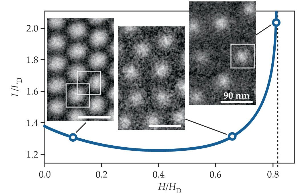A hexagonal skyrmion lattice evolves in the presence of weaker applied magnetic fields in materials that allow nucleation. The calculated size of the skyrmion cell varies with the reduced applied magnetic field, /. The characteristic parameters and are the helix period and saturation field, respectively. The insets are three electron holography images of skyrmion lattices in a thin layer of iron monogermanide for different applied magnetic fields—from left to right, 100 mT, 350 mT, and 400 mT. The white squares indicate individual skyrmions. (Adapted from ref. 15.)