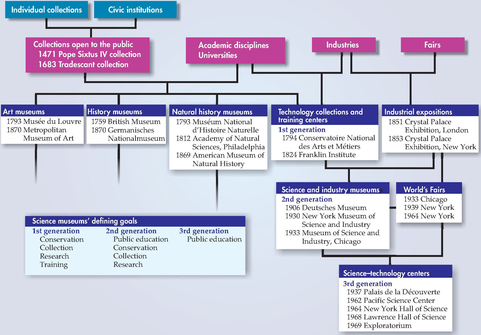 Figure 2. This family tree of science and technology museums traces the evolution of the science museum from private and civic collections to today’s science-technology centers, whose sole purpose is to inspire and educate the public. The boxes indicate only a small number of representative museums. The tree does not show the continuing development of other forms of museums or their ongoing interactions with science and technology museums, topics under study by others.14