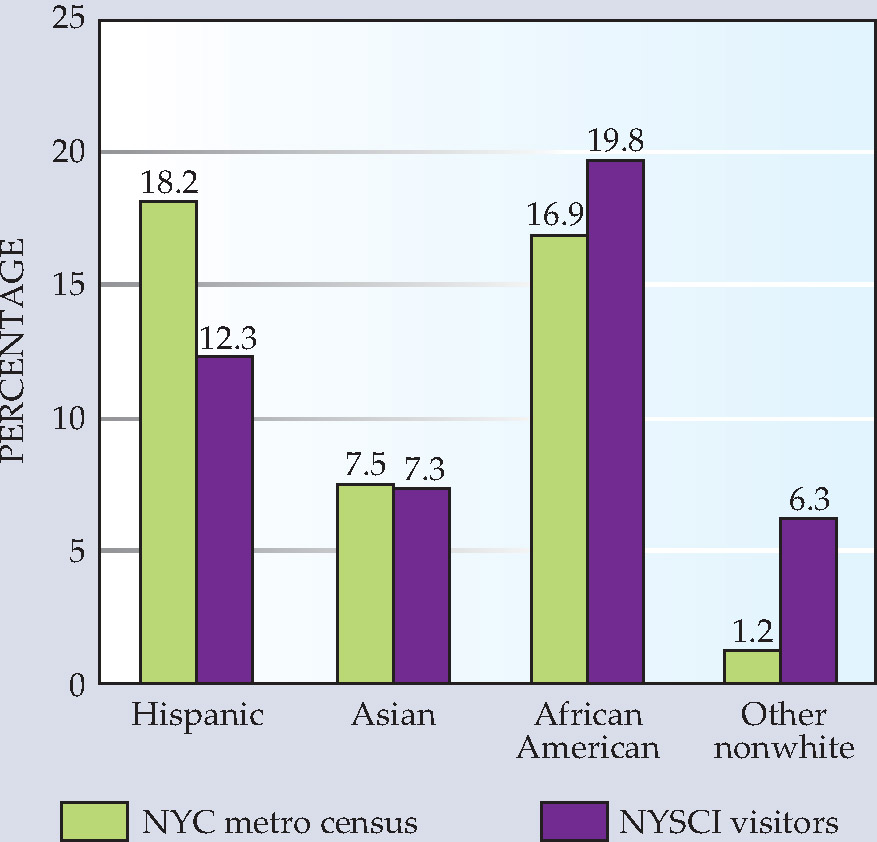 Figure 4. Visitors to the New York Hall of Science (NYSCI; purple) reflect the diversity of the museum’s locale in Queens, New York (green). The visitor data are averages of surveys taken in 2003-05 by Morey and Associates for the NYSCI. The comparison demographics come from the New York City metro census of 2000.