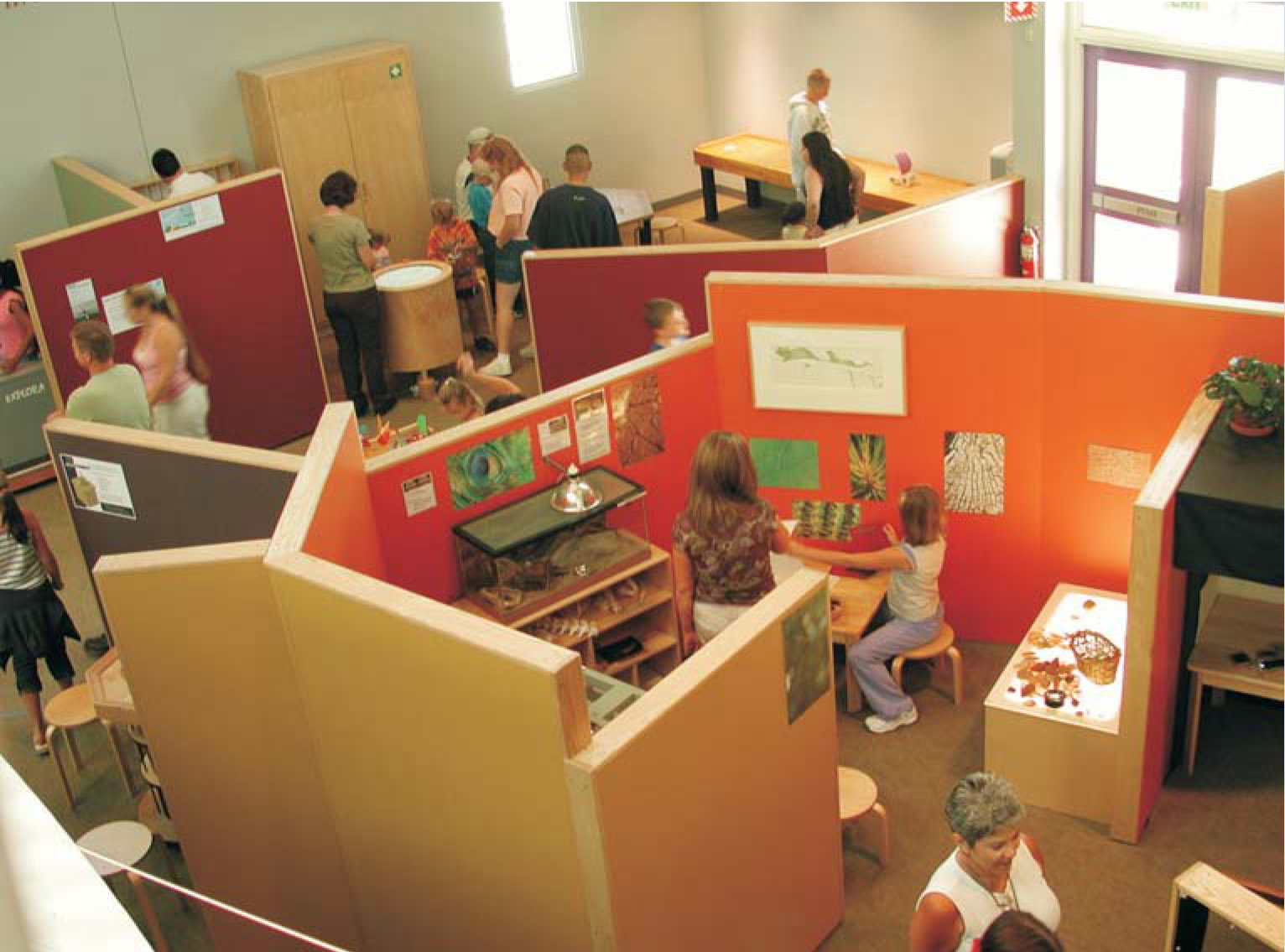 Figure 5. The Explora in Albuquerque, New Mexico, like many third-generation science-technology centers, has both original and fairly common hands-on science exhibits. What is unusual is that Explora provides semiprivate spaces around each unit. As a result, families spend more time engaging with and discussing the exhibits than they do in the usual big, open exhibition floors.