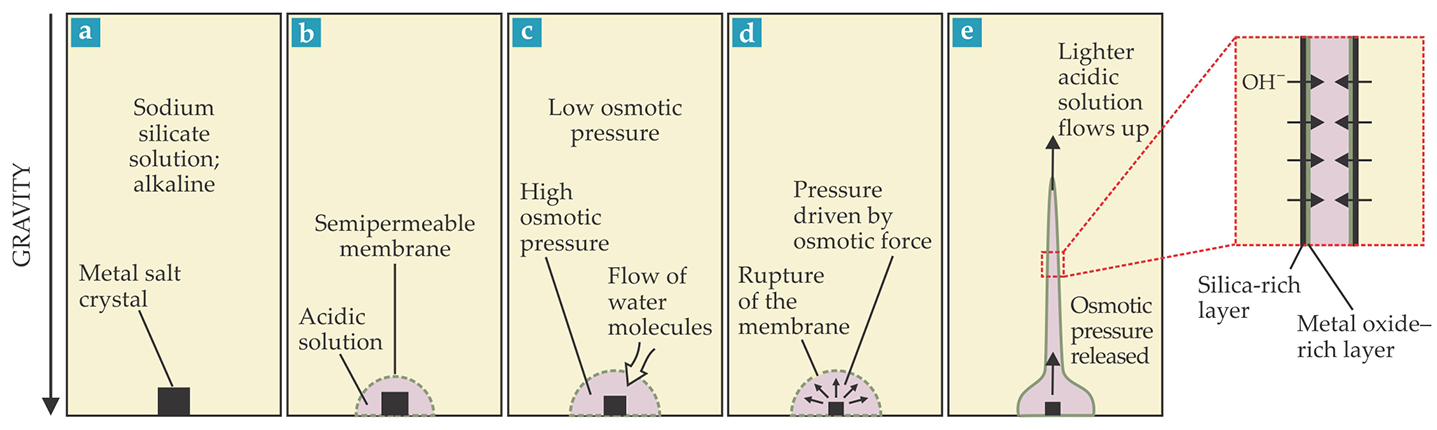 There are many variations on the classical chemical garden experiment, but they all feature chemically contrasting solutions that form a self- assembling inorganic precipitate membrane at their interface. Similar processes can occur in natural geological settings. An example that is potentially of great scientific importance is hydrothermal-vent-driven chimneys on the ocean floor (see figure 5). Hydrothermal chimneys were discovered in the 1970s in “black smoker” vents on the volcanically active mid-ocean ridge. The vents release an influx of superheated, mineral-rich, acidic fluid into the cold seawater through fissures in the ocean crust. The various pH, chemical, and thermal gradients between the vent fluid and seawater lead to the precipitation of minerals at the fluid inlet point, where they form a hollow chimney through which the hydrothermal fluid continues to flow. Precipitate particles also billow out from the vent plume as “smoke” and are later deposited in hydrothermal sediments.