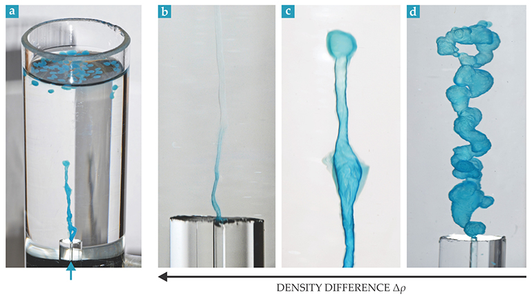 One of the first advances from such studies was the identification of distinct growth regimes in chemical garden formation (figure 2). If the injected interior solution is highly buoyant, open-tube growth occurs around an ascending fluid jet. At some lower density difference