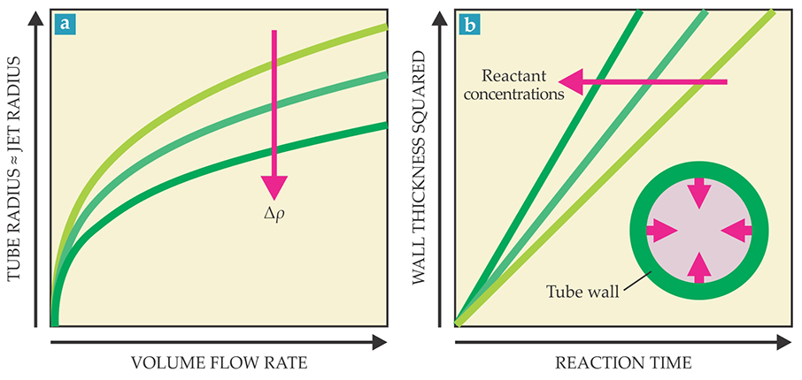 Figure 3. Jetting tubes can be explained quantitatively. (a) A jetting tube’s outer radius (50–500 μm) is determined by the radius of the buoyant reactant jet and depends on the injection rate and on the density difference