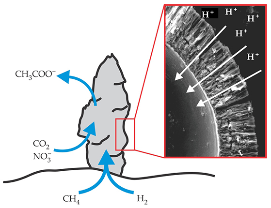 Figure 5. Hydrothermal vents as chemical gardens for the origin of life. The schematic represents an ancient hydrothermal mound precipitated on the early Earth sea floor. Water–rock reactions in the ocean crust produce a reduced alkaline hydrothermal solution that feeds into an acidic carbonic ocean. At the interface of ocean and hydrothermal fluids, an inorganic semipermeable chimney membrane—a geological chemical garden—forms. The wall of the chemical garden is spanned by two types of steep chemical disequilibria: redox gradients, defined by electron acceptors such as nitrate and carbon dioxide in the ocean and electron-donating fuels hydrogen and methane in the hydrothermal fluid, and a pH gradient between acidic ocean and alkaline hydrothermal effluent that provides a proton motive force. Acetate is the waste product. Within the porous chimney wall, redox and pH transmembrane gradients could couple to biosynthesis reactions by free-energy-converting mechanisms and possibly drive an emergence of metabolism. (Figure adapted from reference
