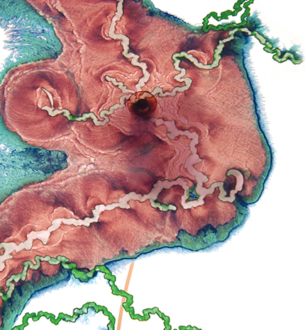 Injecting solution rather than using seed particles has been an important step toward controlled and quantifiable studies of chemical gardens. Other simplifications have also been pursued to control the precipitation process. For instance, the reaction can be carried out in Hele-Shaw cells that confine the entire system to a thin, flat layer of solution into which the second reactant is injected at a constant rate (see figure 4). The resulting structures are essentially flattened versions of the conventional chemical gardens but reveal some novel features that either do not exist or are hidden in three dimensions.