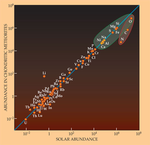 In our own solar system, detailed studies of meteorites have shown that one rare class of carbonaceous meteorite (the CI carbonaceous chondrites; the I is for the prototype Ivuna meteorite) has—with the exception of the most volatile elements such as hydrogen and helium—a chemical composition that’s almost exactly solar (see figure 2). Those meteorites represent undifferentiated protoplanetary material left over, in small asteroids, from the process of planet formation.