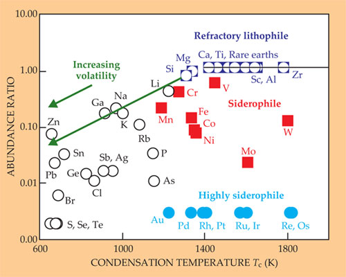Figure 3. Abundances of elements in Earth’s silicate crust and mantle, normalized to abundance in CI chondrite meteorites, are plotted against each element’s volatility, as measured by the condensation temperature Tc at which 50% of its atoms in the protoplanetary gas disk would have condensed. Elements with high Tc and therefore low volatility are called refractory. Their readiness to dissolve in molten iron is color-coded as siderophile (iron loving) or lithophile (rock loving). The figure shows increasing depletion in Earth’s crust and mantle (relative to the meteorites) with increasing volatility and siderophilia. (Adapted from ref.