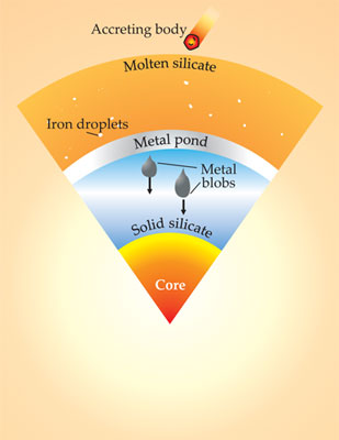 Figure 4. Deep magma ocean model of core formation. The high pressures required by partitioning of siderophile elements from Earth’s mantle to its core imply that iron descended in droplets through a deep molten silicate layer, equilibrating with the silicates as they fell. Because the pressures are much lower than at the core–mantle boundary, it’s conjectured that the molten iron and siderophile elements dissolved in it formed a pond shell at some intermediate depth where there was a transition from molten to solid silicate. The dense metal-pond layer eventually became gravitationally unstable so that large metal blobs descended to the core. (Adapted from ref.