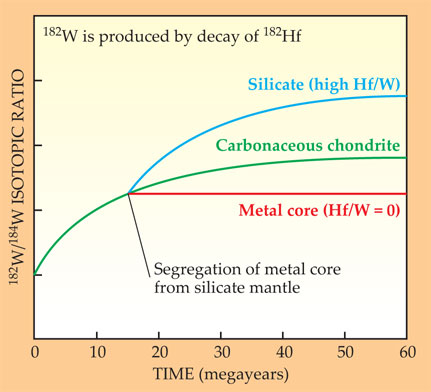 If now an iron core separates in the planet, there will be strong chemical fractionation of W from Hf, with siderophile W mostly entering the core and lithophile Hf remaining entirely in the rocky silicate layer. From then on, the core’s 182W/184W ratio remains constant because it has no 182Hf to decay to 182W. The silicate layer, by contrast, contains all the Hf and very little 184W. So in that layer, the 182W/184W ratio increases more rapidly by radioactive decay than it did in the initial mix. After five half-lives, the 182Hf is essentially extinct, so that the W isotope ratio levels off to a constant value.